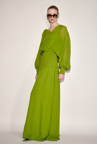 Long dress in "georgette" chiffon in flowing silk in bright green, with a waist highlighted by a wide "SMOCK", loose bodice with a slit neckline closed by a tie. Transparent "balloon" sleeves with a "SMOKE" cuffs and a full skirt.