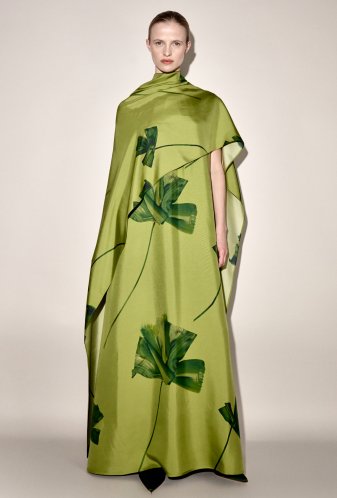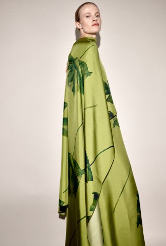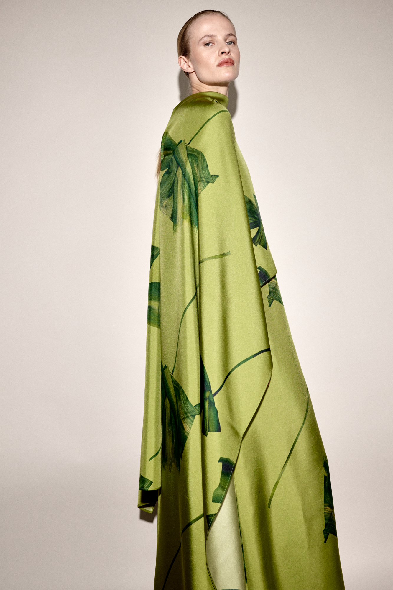 Long flared dress in fluid olive-green silk, featuring a dark green botanical print. Sleeveless, with a pleated high neckline and finished with an extra-long scarf in the same fabric.