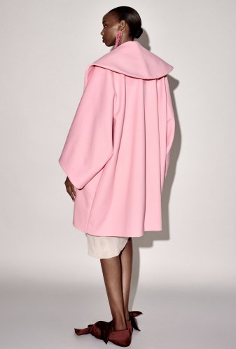 Manteau court look “oversize”en toile de coton/soie rose, enmanchures “raglan”, manches longues et larges, avec col revers majestueusement gigantestque.