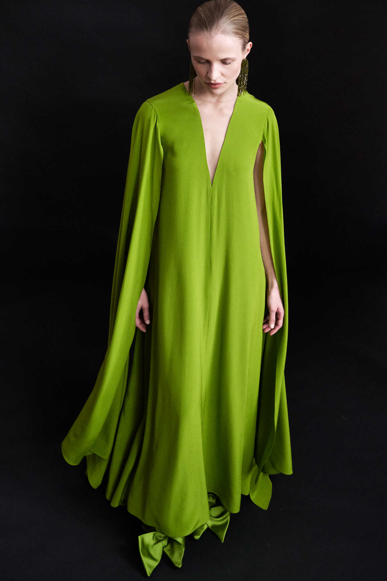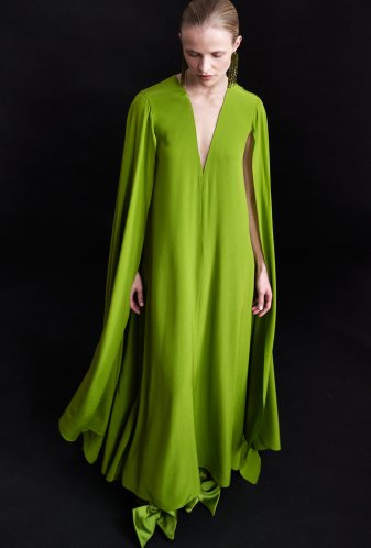 Longue robe fluide sans cintrage en soie crêpe de chine vert olive, encolure profonde en « v » maintenue par du tulle « nude », bras recouverts, chacun par un long pan fendu effet cape.