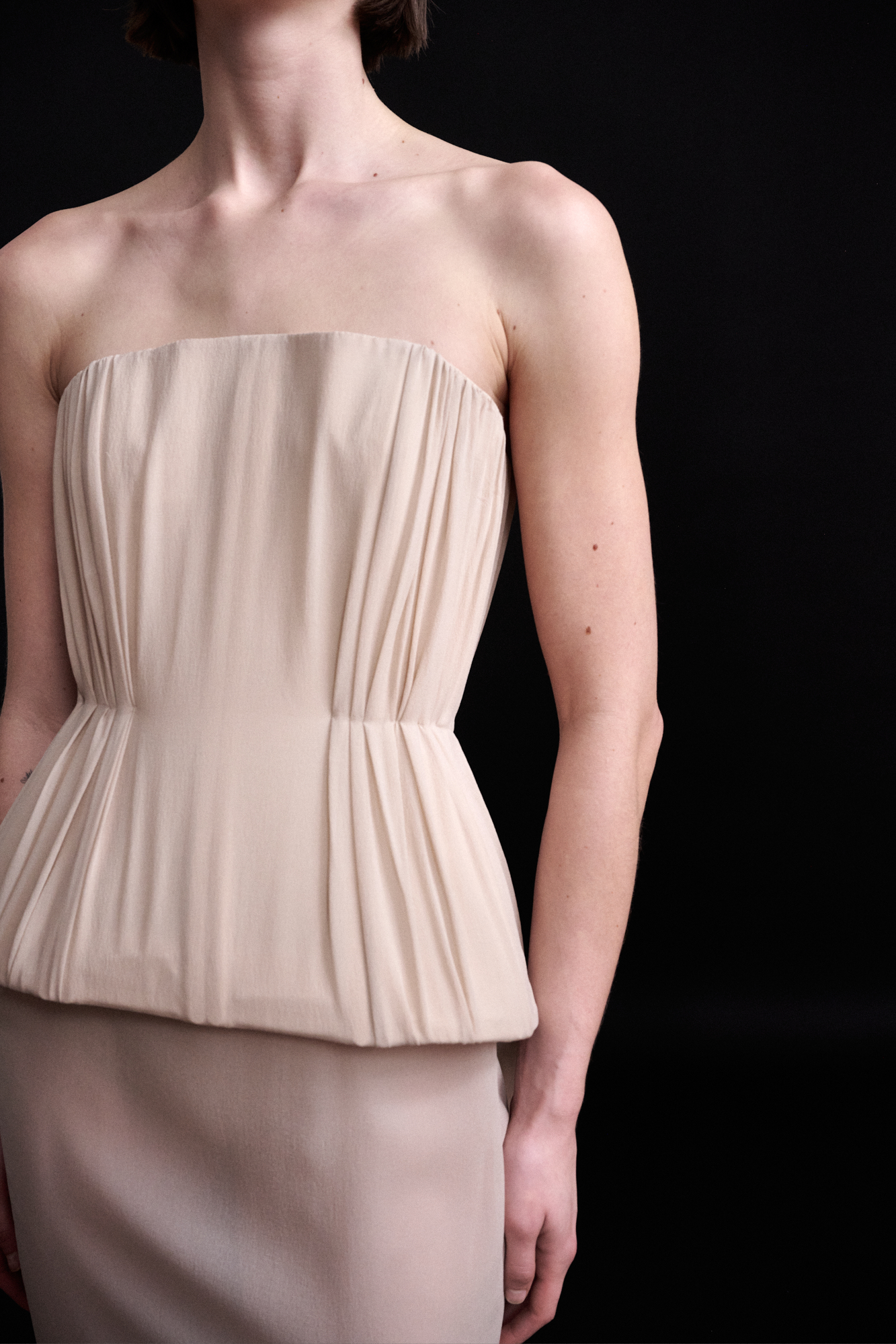 Bustier minimaliste sculpturale au look « moderne » en mousseline de soie rose pâle légère et translucide, structuré par un glaçage raide et magnifié de plis, marqué par une taille cintrée avec une basque qui se décolle des hanches