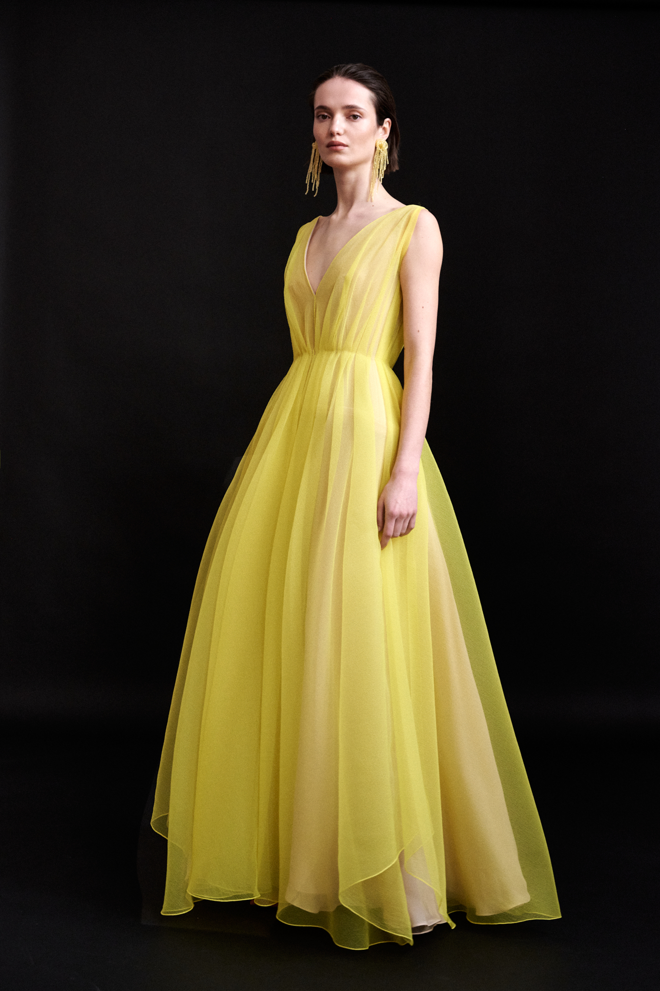 Longue robe vaporeuse, cintrée à la taille et évasée au bas en crêpe d'organza jaune, drapé d'un plissage régulier superposé sur fond de soie poudre offrant un jeu subtil de transparences, sans manche avec un décolleté en "V" profond et élégant au dos et au devant.