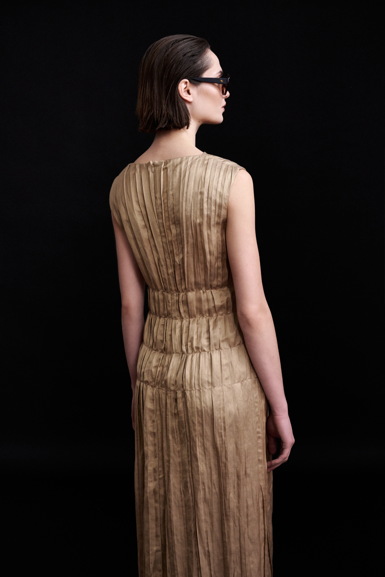 Robe longue plissée et droite en lin/viscose beige avec apprêt soyeux, encolure droite ras de cou, sans manche, taille mise en valeur par trois rangs élastiqués qui la rend unique.