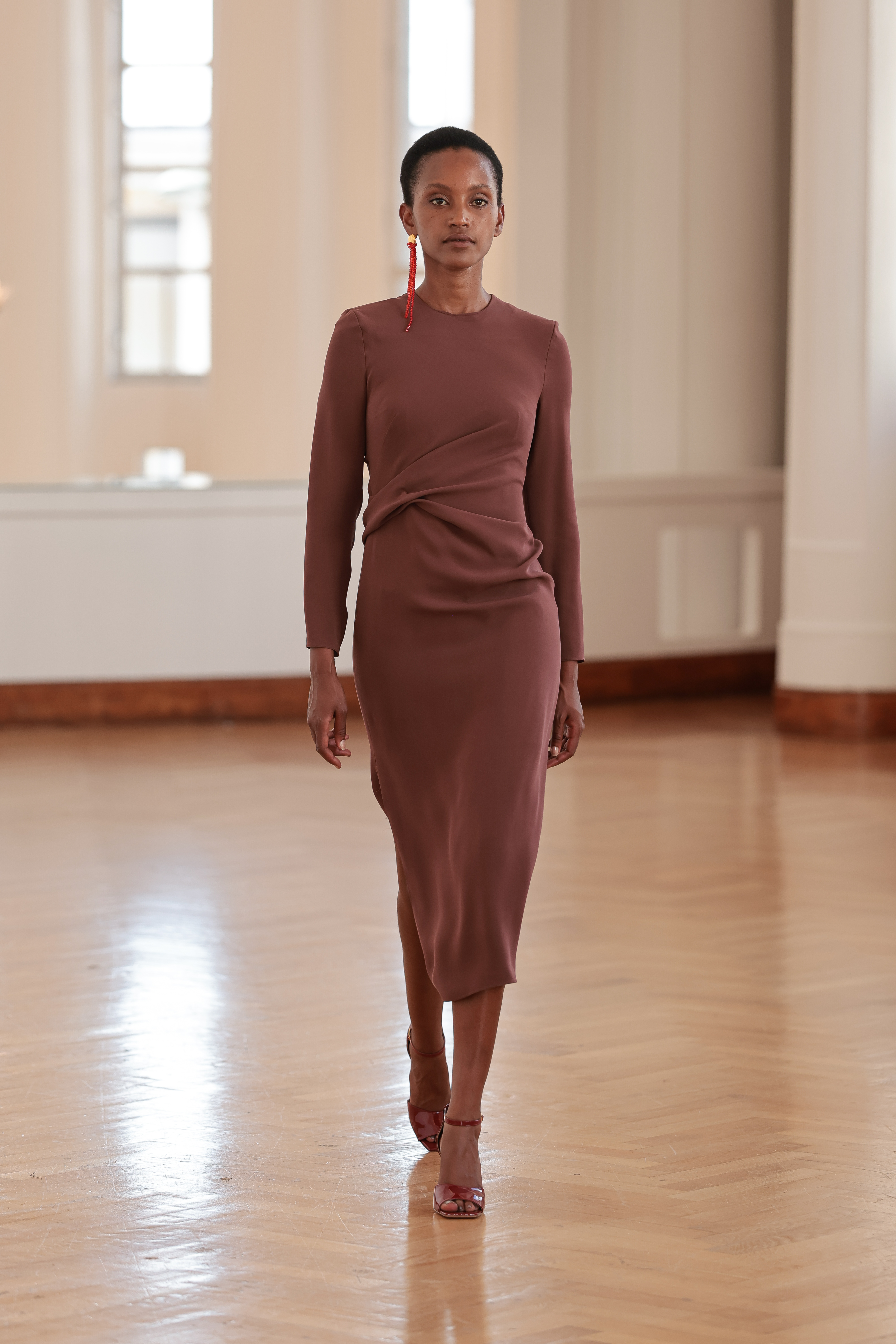 Mid-lange kokerjurk van lichte, vloeiende zijde, met lange mouwen en een ronde halslijn, geaccentueerd in de taille door asymmetrische drapering.