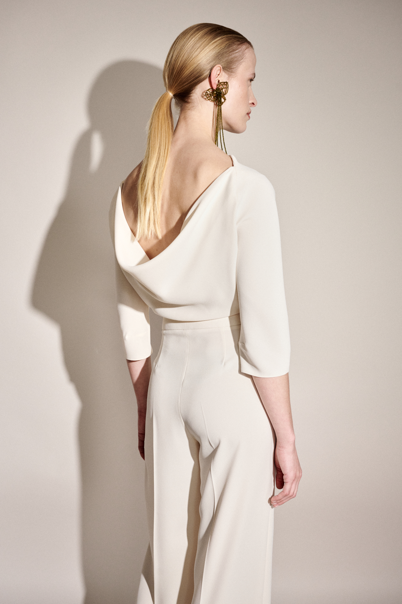Jumpsuit in gebroken witte polyestervezels, met een hoge halslijn en een sobere mouwloze snit. Voorzien van rechte driekwartmouwen, een elegant gestrekt silhouet, een rechte broekspijp die onderaan licht uitloopt, met nervuurplooien en een taille-inzet.