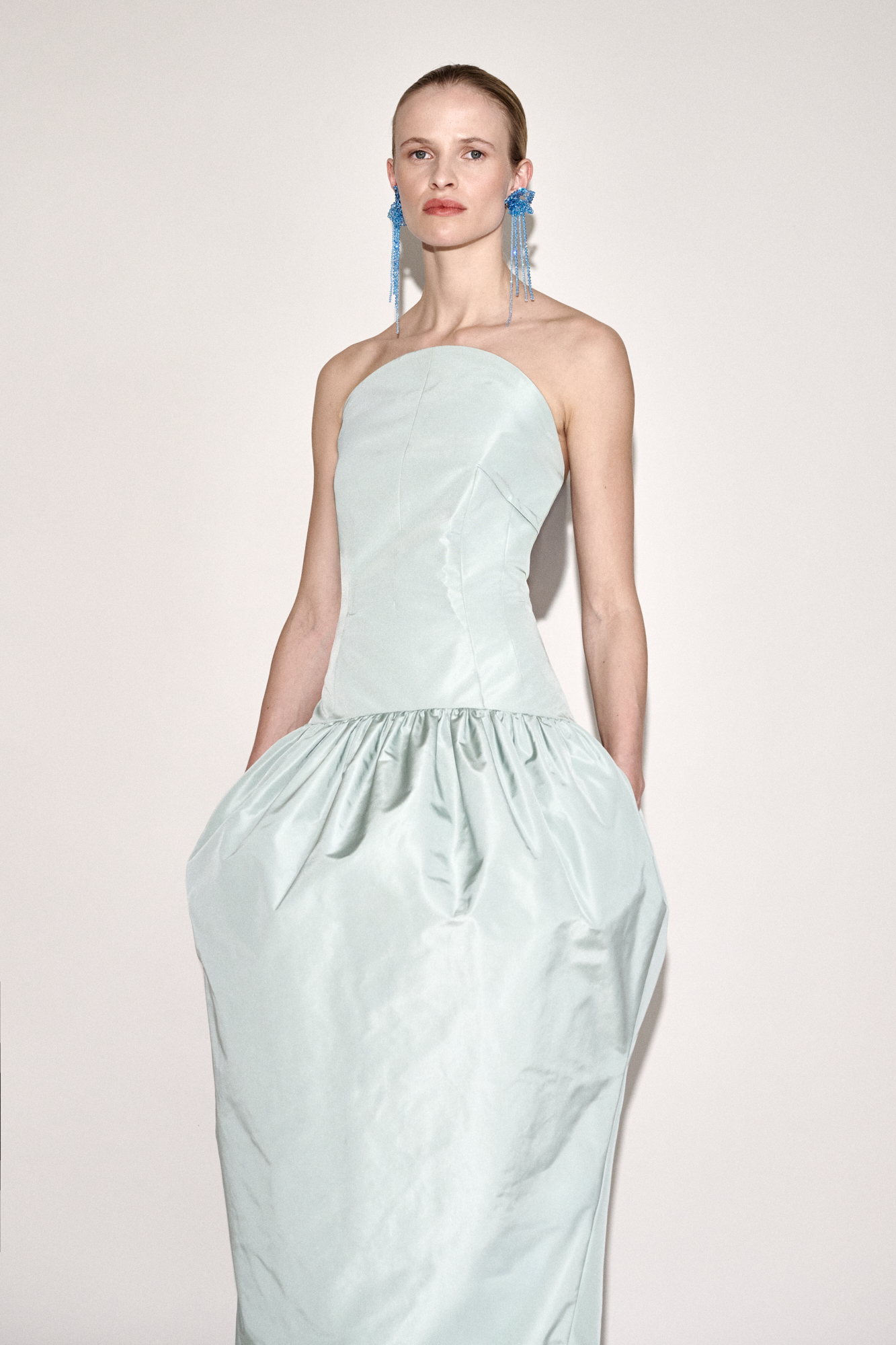 Lange bustierjurk met afgeronde halslijn, uitgevoerd in zijde faille in de tint azur brume. Lang en getailleerd lijfje, laag in de taille aansluitend op een geplooide rok die bovenaan volumineus en overdreven gebubbeld is, en naar onder toe versmalt.