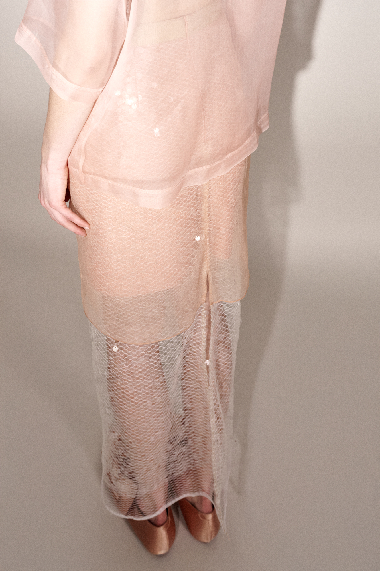 Lange, rechte en transparante rok met een subtiele glans, uitgevoerd in witte paillettentule. Het ontwerp speelt met transparantie door gelaagde materialen in verschillende lengtes.