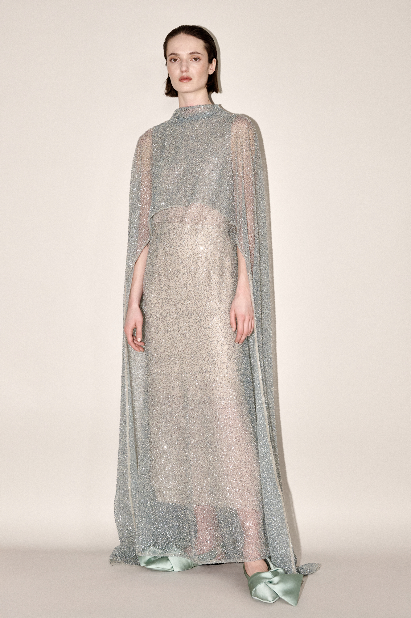 Lange, sprankelende mouwloze jurk, afgewerkt met een korte capeline aan de voorzijde en een lange capeline aan de achterzijde in dezelfde stof. Uitgevoerd in hemelsblauwe tule rijkelijk bezet met aqua-blauwe pailletten, met een hoge halslijn en subtiel gevoerd met een poederkleurige onderlaag die zichtbaar blijft door de transparantie.