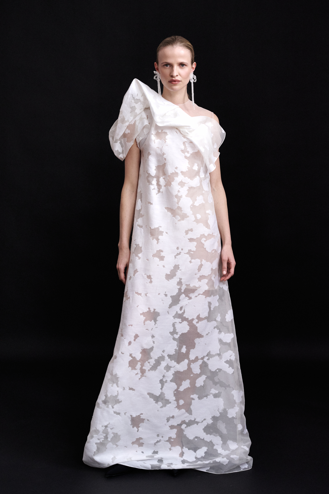 Long flared dress without waist shaping, crafted from white silk/cotton devoré fabric with cut-thread motifs and a play of transparency. Sleeveless, featuring a high tulle neckline with a faux bustier effect, and elevated by an asymmetric drape across the upper bodice.
