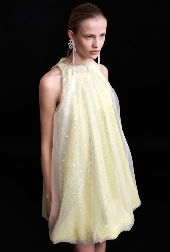 the bubbled neckline and bottom hem, exceptional by the superposition of transparent layers of white organza georgette on a background of white sequined tulle itself covering