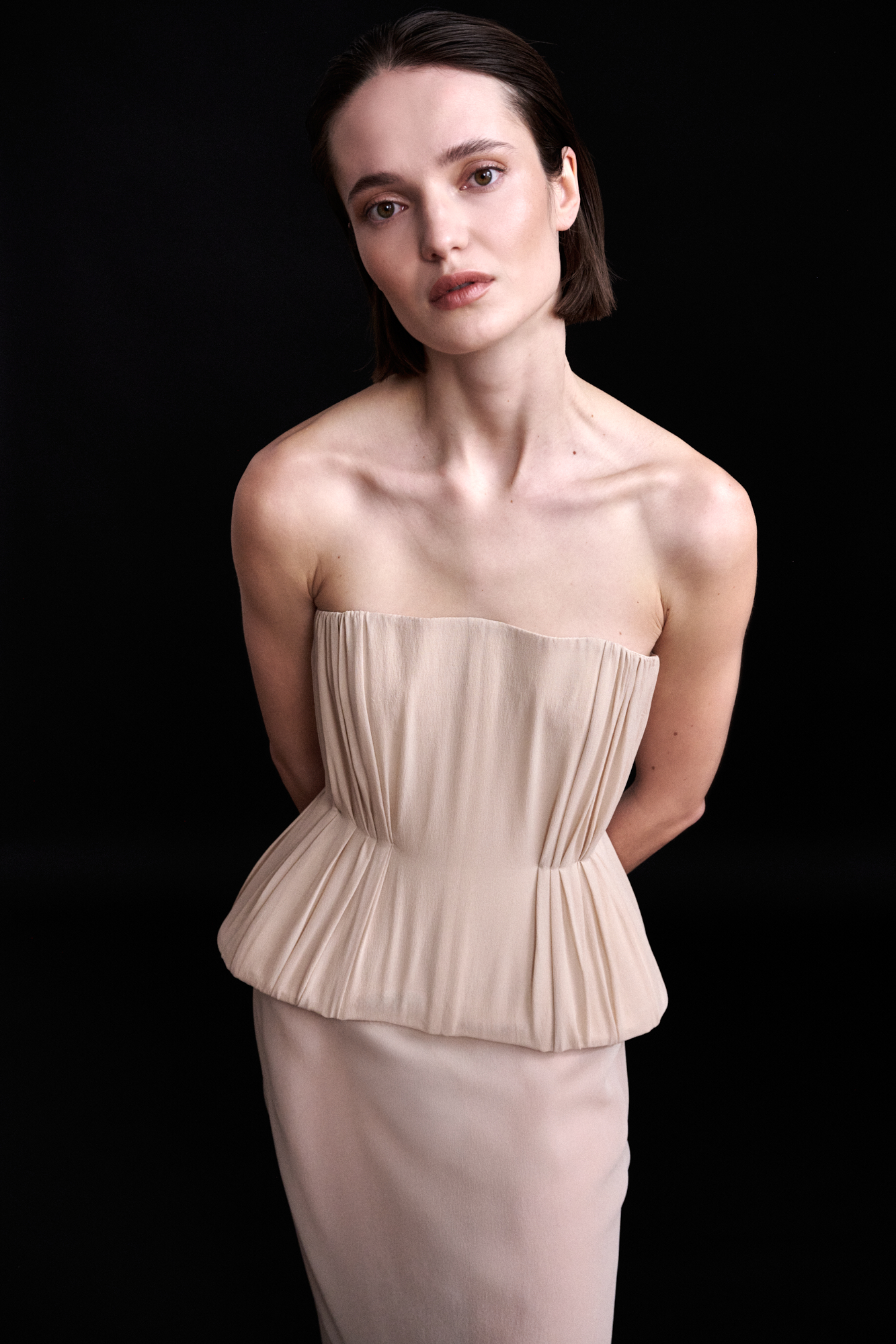 Minimalist, sculptural bustier with a modern aesthetic, crafted from lightweight, translucent pale pink silk chiffon. Structured with a rigid organza overlay and enhanced by pleating, defined by a cinched waist and a peplum that lifts away from the hips.