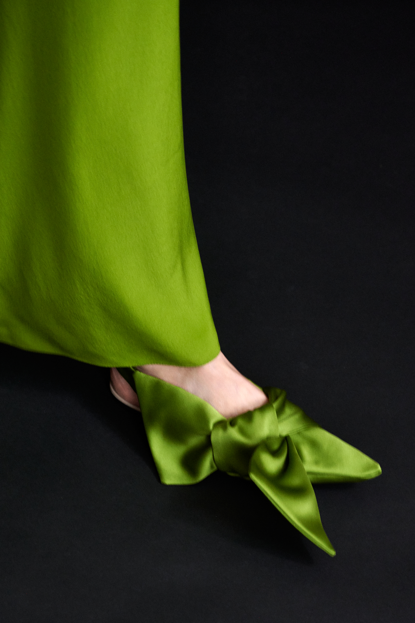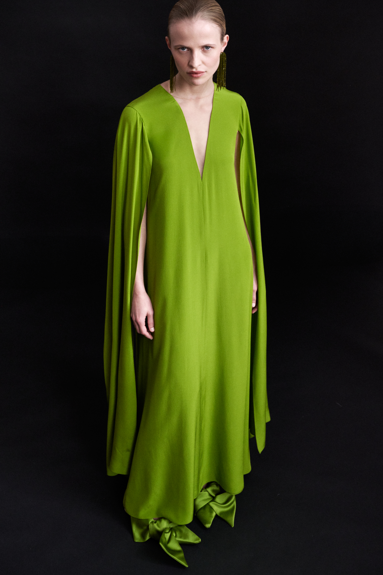Longue robe fluide sans cintrage en soie crêpe de chine vert olive, encolure profonde en « v » maintenue par du tulle « nude », bras recouverts, chacun par un long pan fendu effet cape.
