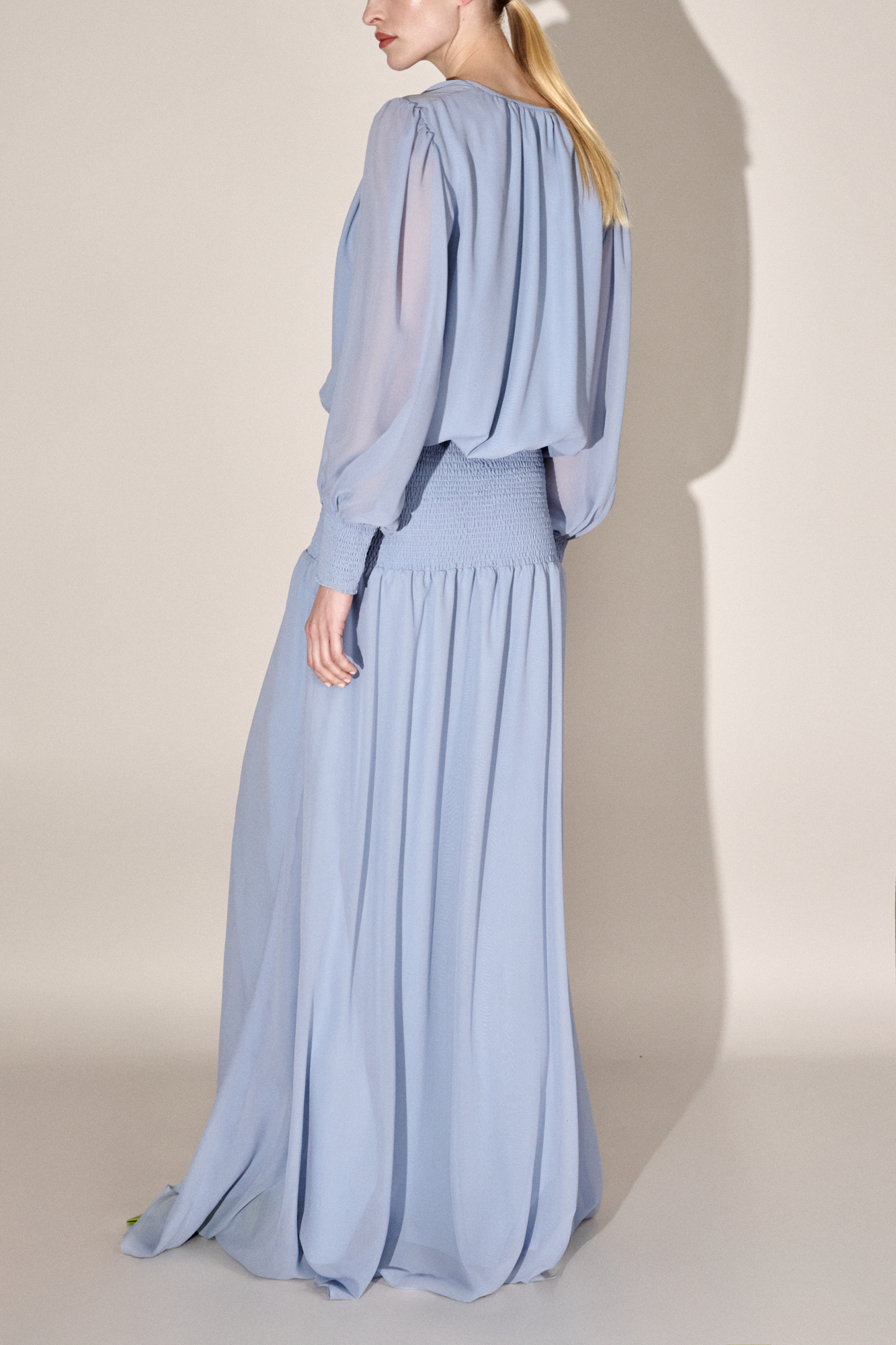 Robe longue en mousseline « georgette » de soie fluide bleue, à la taille mise en valeur par un large « SMOCK », corsage ample avec encolure fendue fermée par un lien. Manches « ballons » transparentes terminées par un poignets « SMOKÉ » et jupe ample.