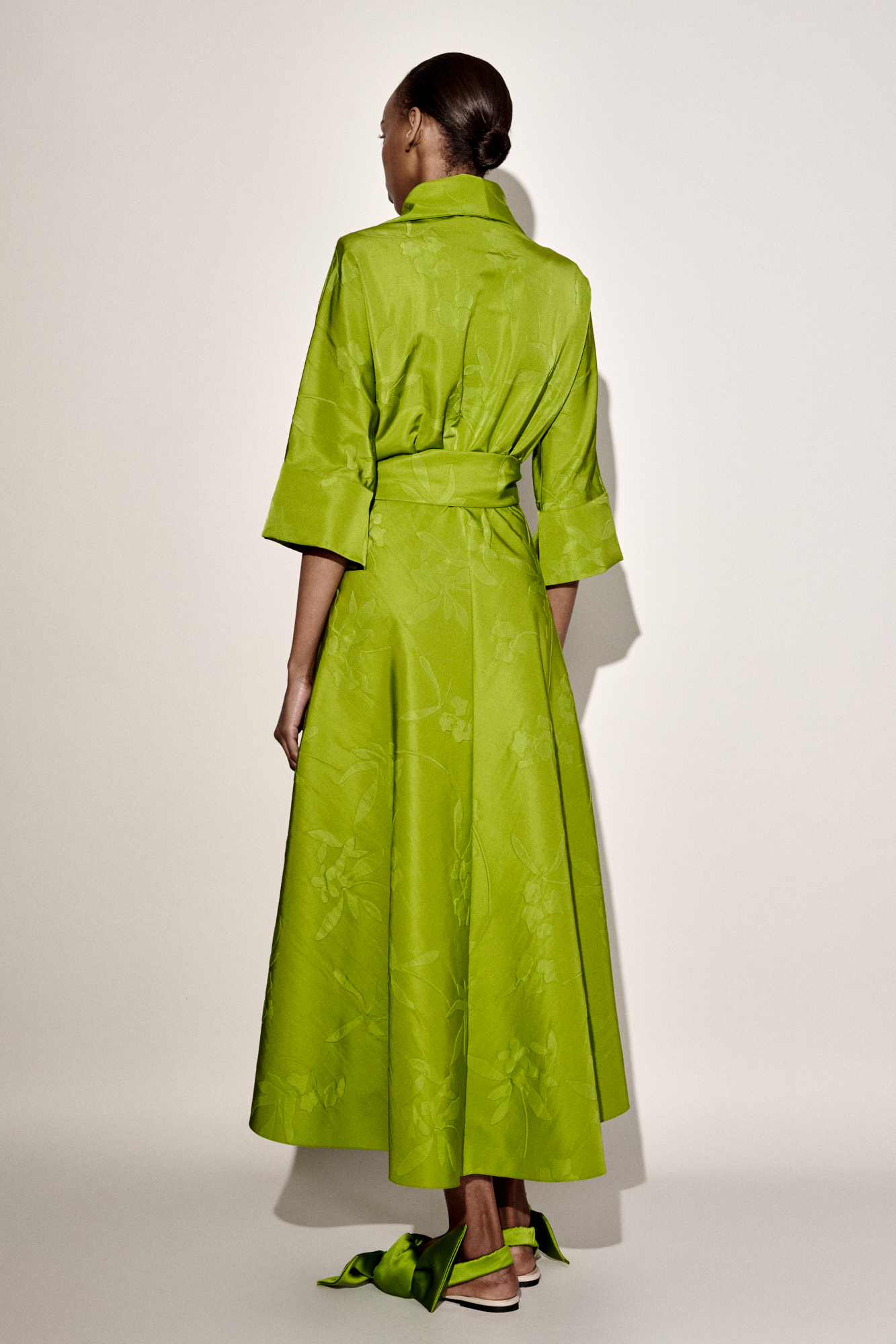 Robe « chemisier » vert olive en jacquard satiné à motif floral « embossed » discret, à taille marquée et jupe ample évasée, dotée d’un col montant structuré, de manches trois-quarts et d’une ceinture ton sur ton intégrée.