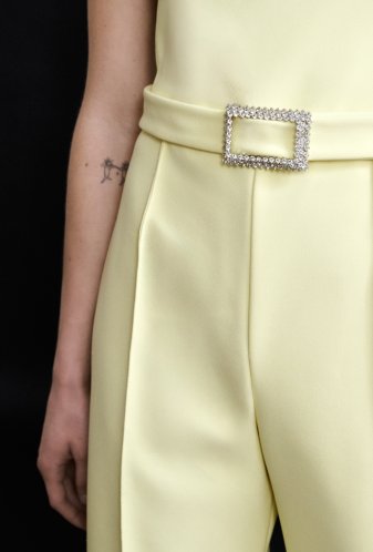 voor- en achterkant met onzichtbare nude bandjes, de taille wordt gemarkeerd door een riem met lussen en geaccentueerd door een rechthoekige strassgesp