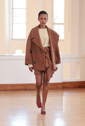 ¾-lange oversized mantel in wol met grote reverskraag, lage oksels en wijde mouwen, dubbele knoopsluiting met grote contrasterende platte parelmoeren knopen.