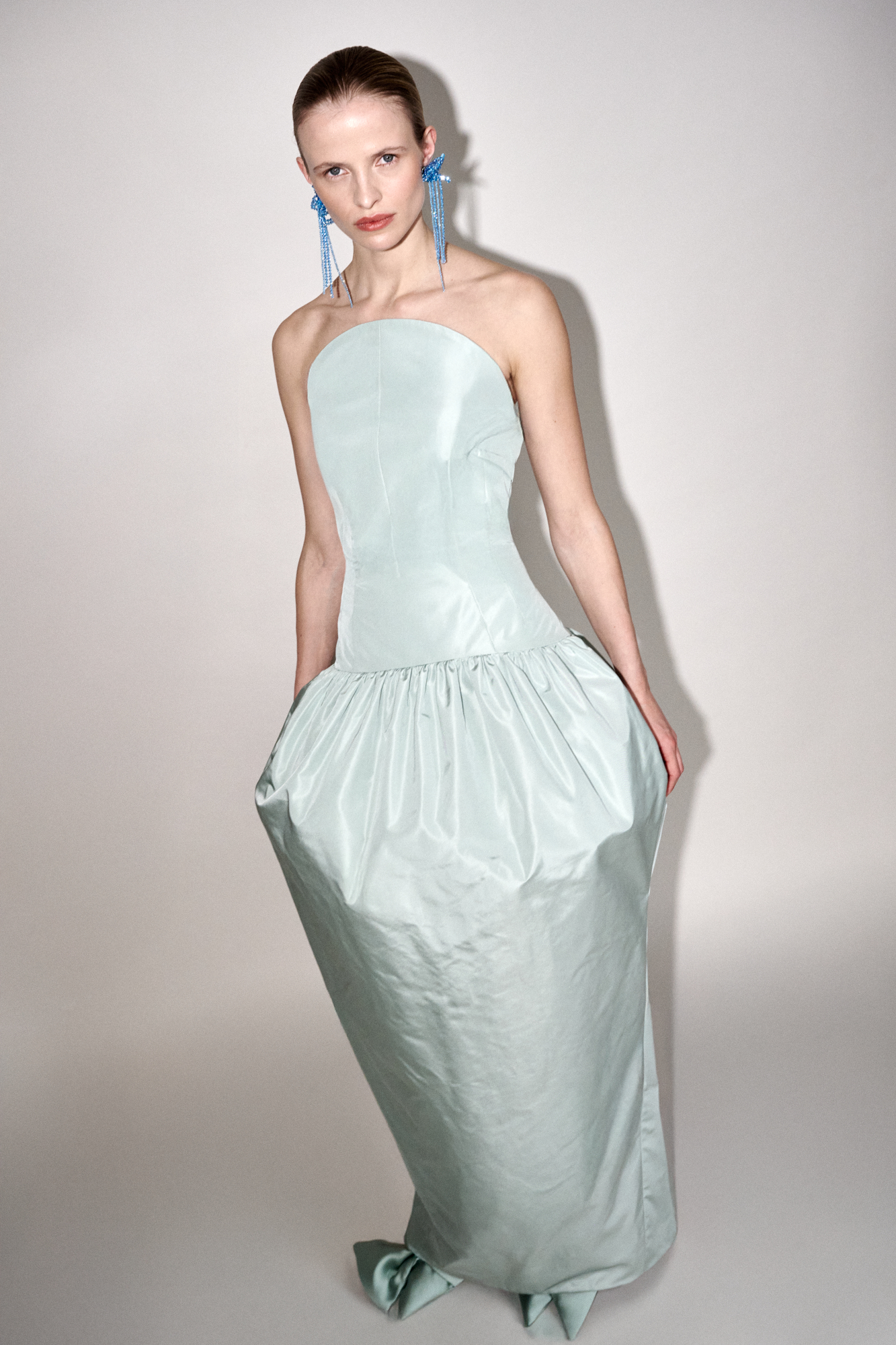 Lange bustierjurk met afgeronde halslijn, uitgevoerd in zijde faille in de tint azur brume. Lang en getailleerd lijfje, laag in de taille aansluitend op een geplooide rok die bovenaan volumineus en overdreven gebubbeld is, en naar onder toe versmalt.