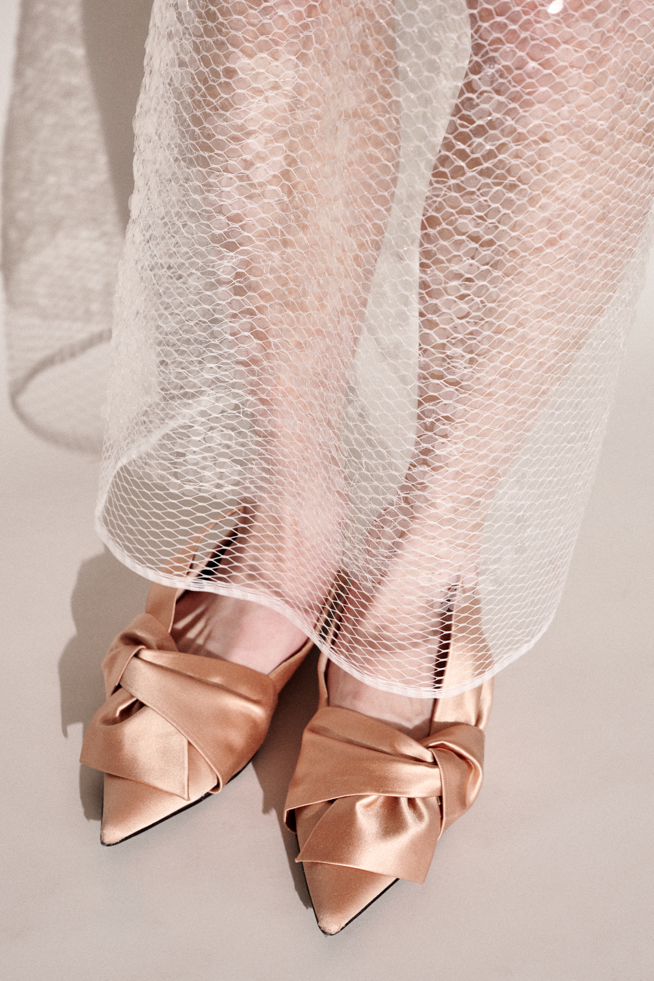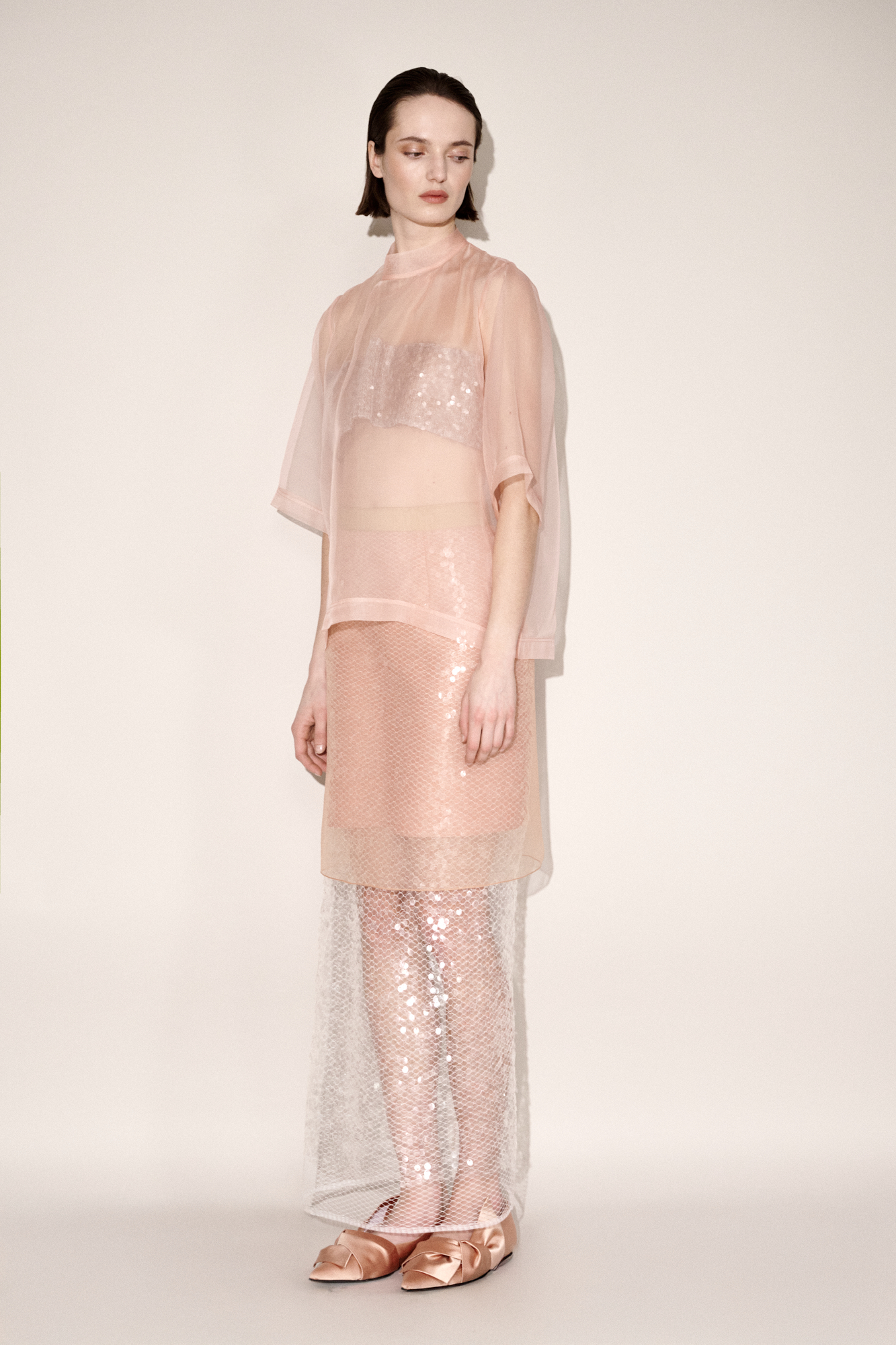 Lange, rechte en transparante rok met een subtiele glans, uitgevoerd in witte paillettentule. Het ontwerp speelt met transparantie door gelaagde materialen in verschillende lengtes.