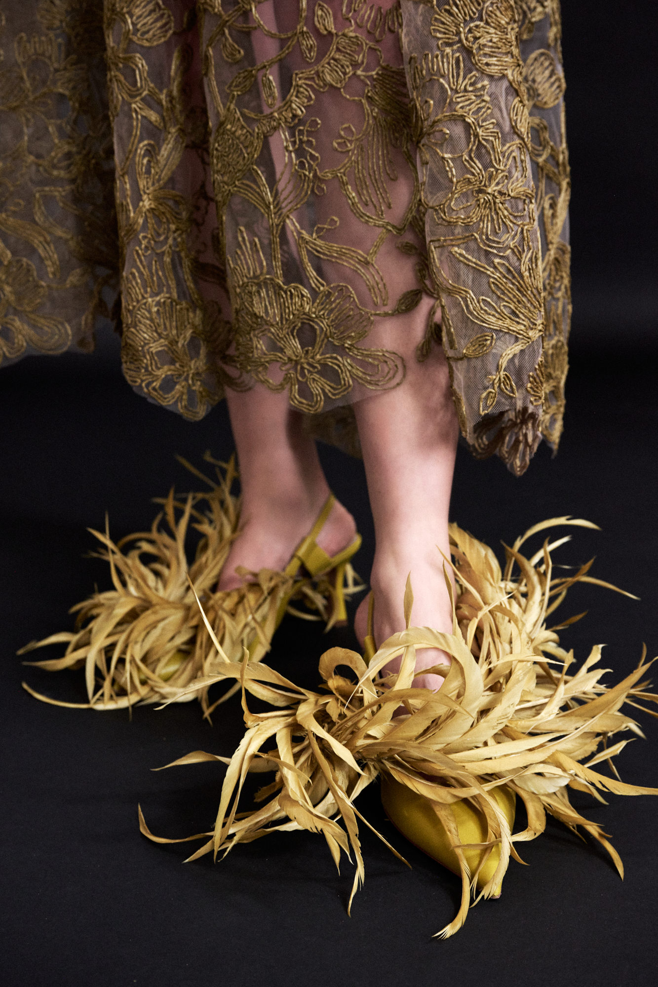 Hak­schoenen in grosgrain, versierd met afneembare broches van hanenveren.