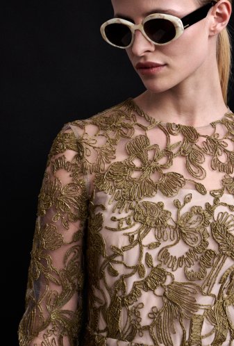 Halflange jurk in “guipure/kant” van limoenkleurige raffia op nude tule, nauwsluitend lijfje