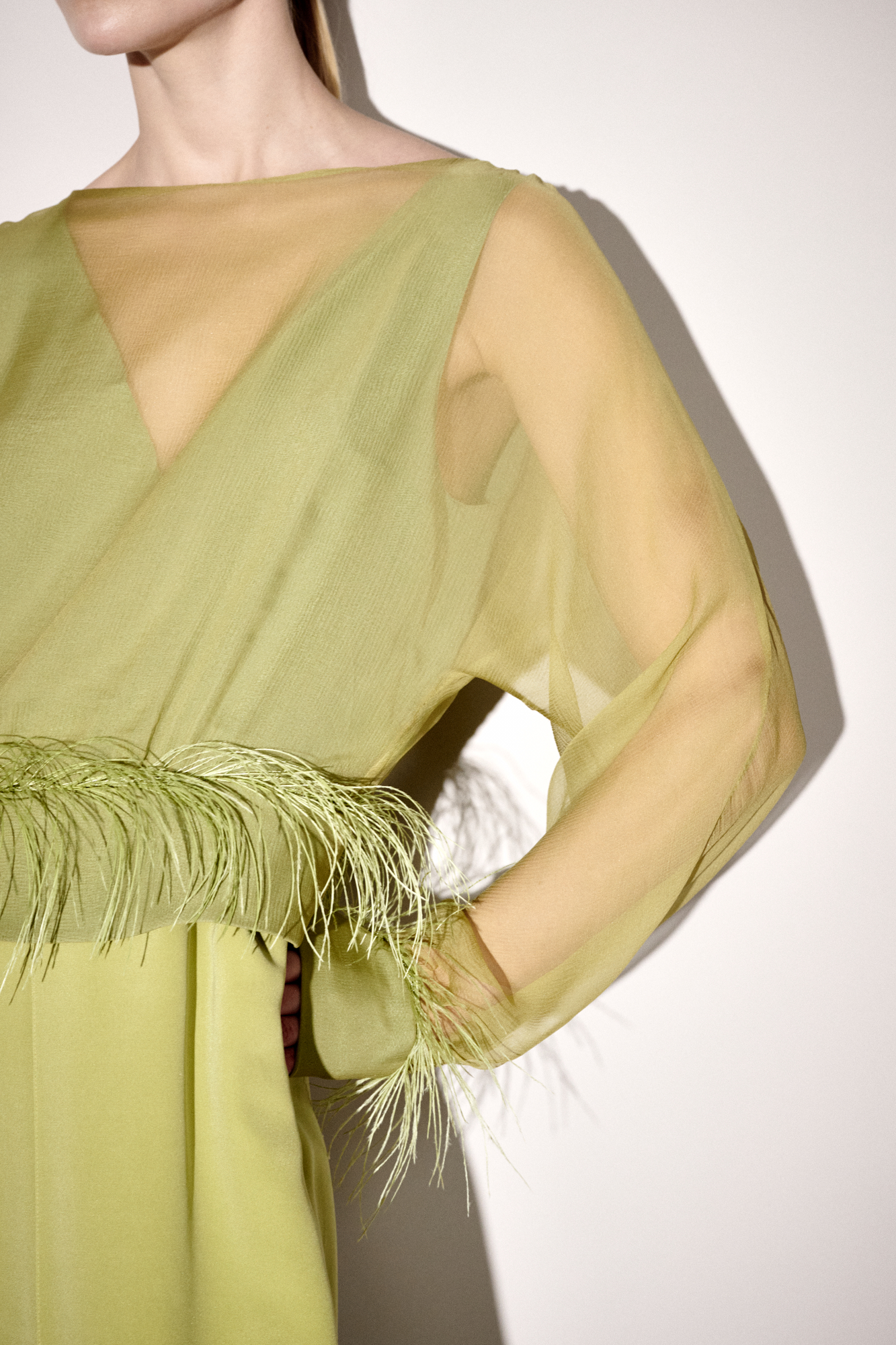 Volledig transparante top in lichte zijden voile in olijfgroene tint, met een rechte hoge halslijn. Voorzien van lange blousemouwen met manchetten, verfraaid met een boa van struisvogelveren, evenals een geaccentueerde taille met een kleine peplum, eveneens afgewerkt met een verenboa.