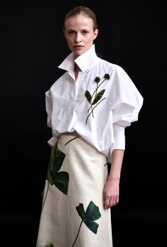 Oversized top/blouse in wit katoen, met een hoge reverskraag, een faux knoopsluiting en ballonmouwen zonder klassieke arminzet, afgewerkt met lange manchetten. De bolvormige rug is onderaan voorzien van een elastiek. De blouse wordt aan de voorzijde verfraaid met een uniek borduurwerk van donkergroene strassparels in een plantaardig motief.