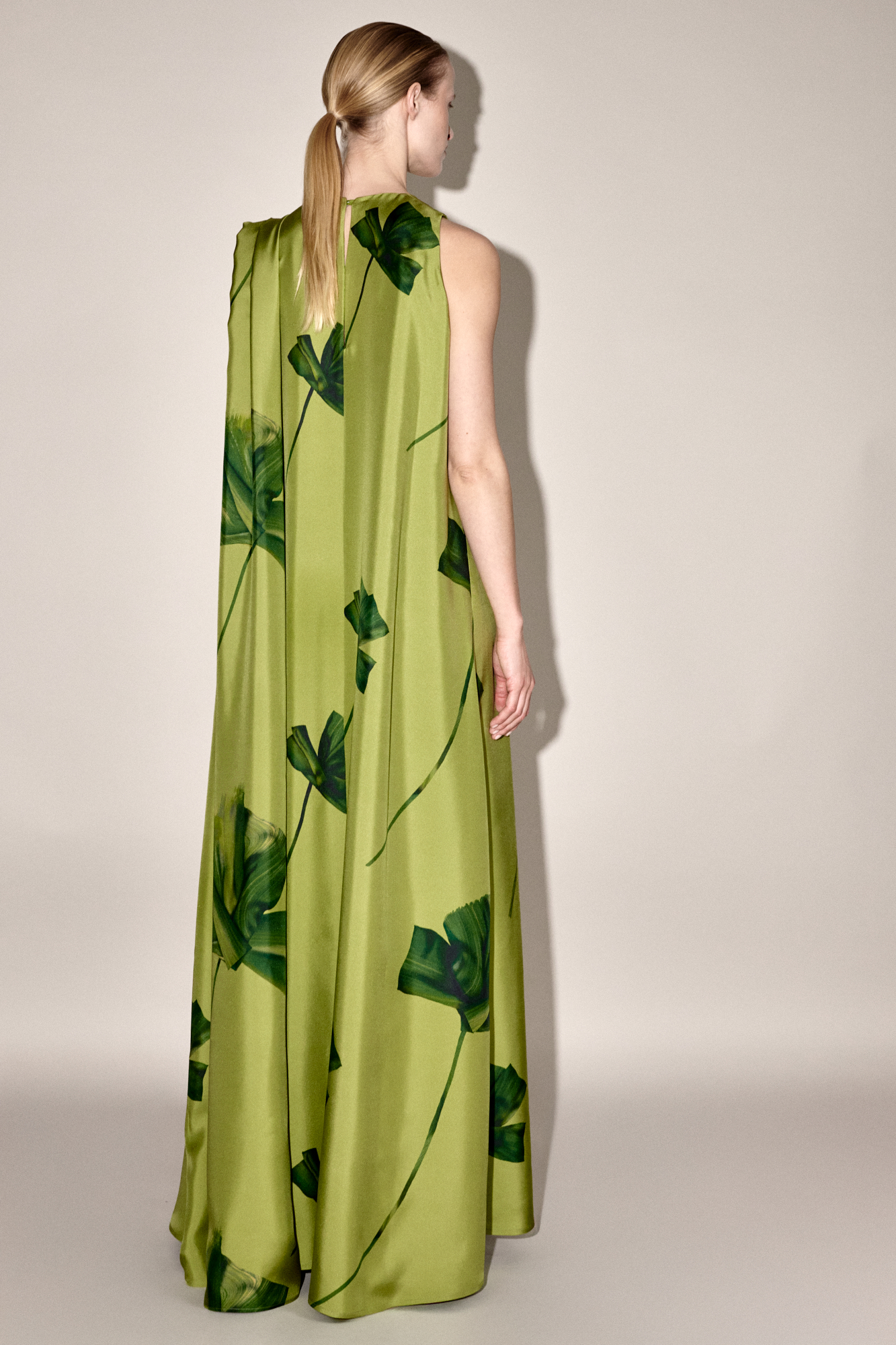 Lange, uitlopende jurk in soepel vallende zijde in olijfgroene tint, met een donkergroene botanische print. Mouwloos, met een geplooide hoge halslijn en afgewerkt met een zeer lange sjaal in dezelfde stof.