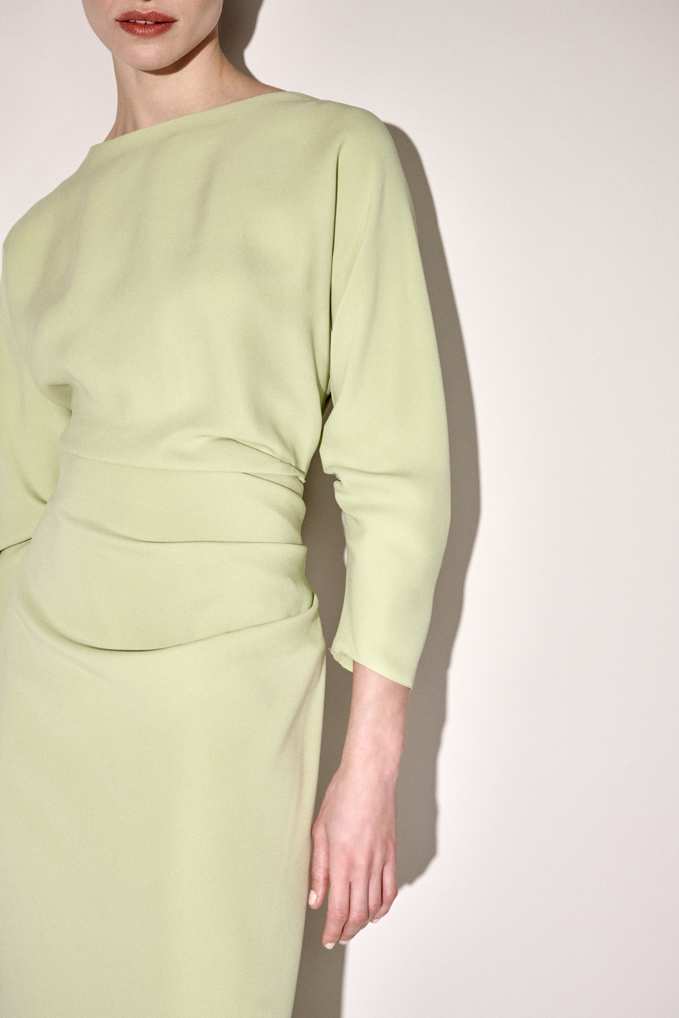 Midi-jurk in soepel vallende matte zijde in een pastelmunttint, met een rechte hoge halslijn, een recht silhouet en driekwart vleermuismouwen, elegant gedrapeerd in de taille.