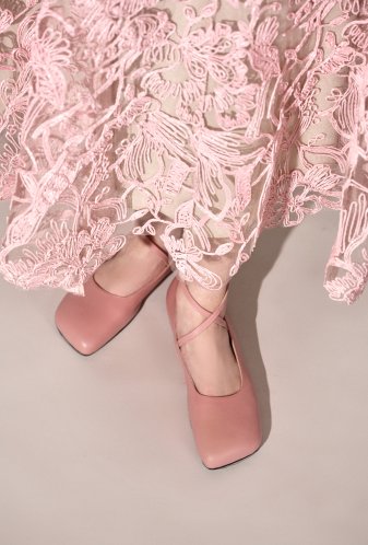 Lange, uitlopende godetrok in pastelroze raffia-guipurekant op nude tule, met een geschulpte zoom en een elegant geaccentueerde taille.