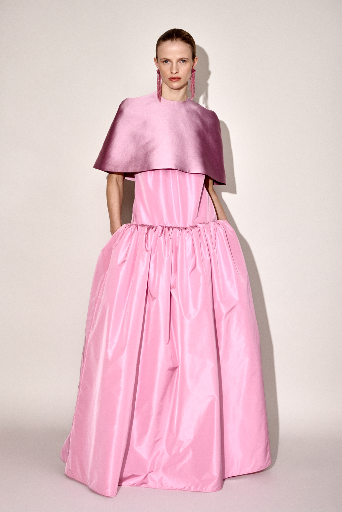 Lange rugloze jurk, in lichtroze taft, gemaakt van een recht, mouwloos gerimpeld lijfje bij de halslijn en passend over een volumineuze "bubbly" rok met een lage en uitlopende taille.
